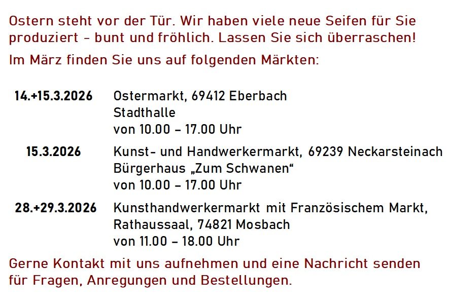 Unsere Seifen bestehen aus hochwertigen biologischen Inhaltsstoffen, sind frei von Parabenen, Paraffinen und Konservierungsstoffen.