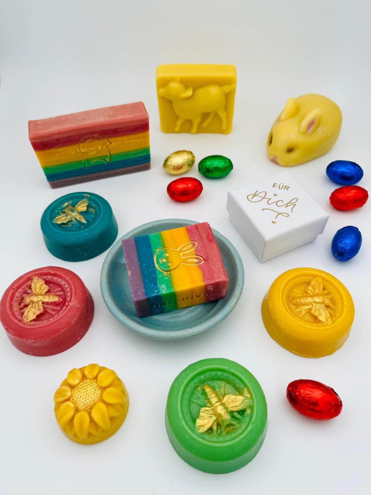 Dazu bieten wir praktische, handgetöpferte Seifenschalen in vielen Farben.